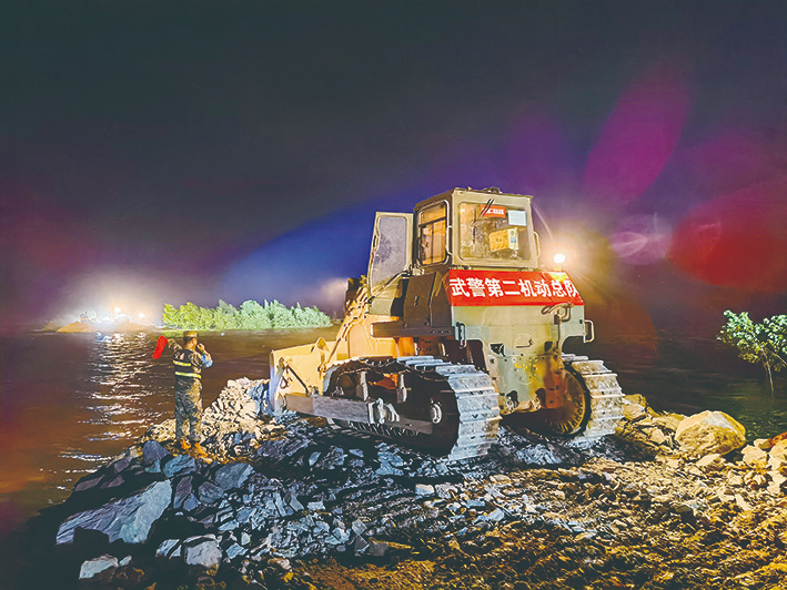 已是7日凌晨三点,武警第二机动总队二级上士李贵权左手挥着红色指挥旗,右手握着手电,指挥推土机把一块块大石料推进决口处。