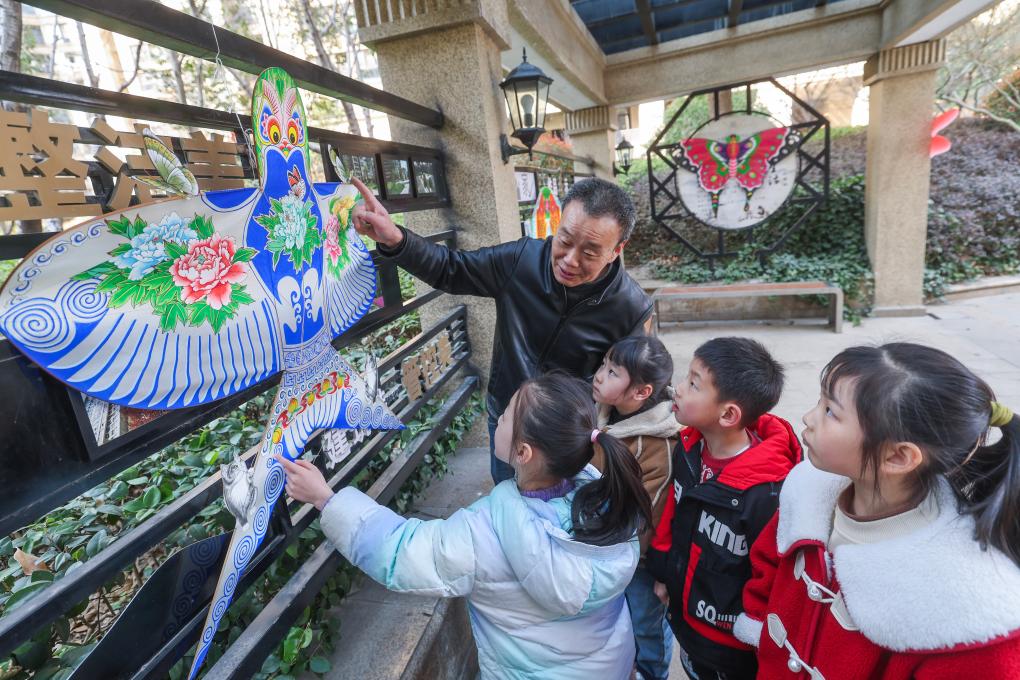 近日,中国风筝协会理事金月强给孩子们介绍传统风筝的结构和特点。